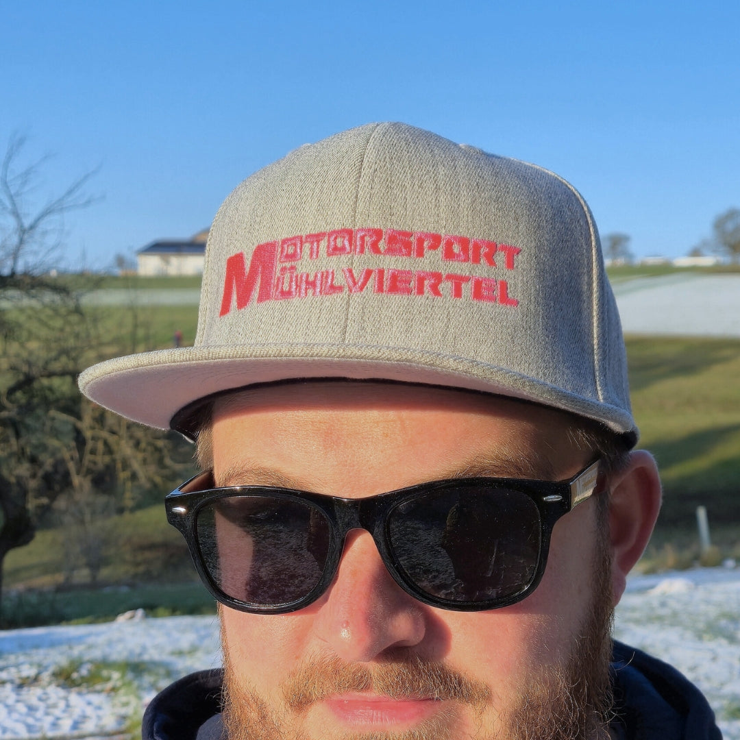 Graues Premium 210 Flexfit Cap mit neonfarbenem Motorsport Mühlviertel Stick (Neongelb oder Neonpink). Hochwertig, bequem und perfekt für Motorsport-Fans! 🏁